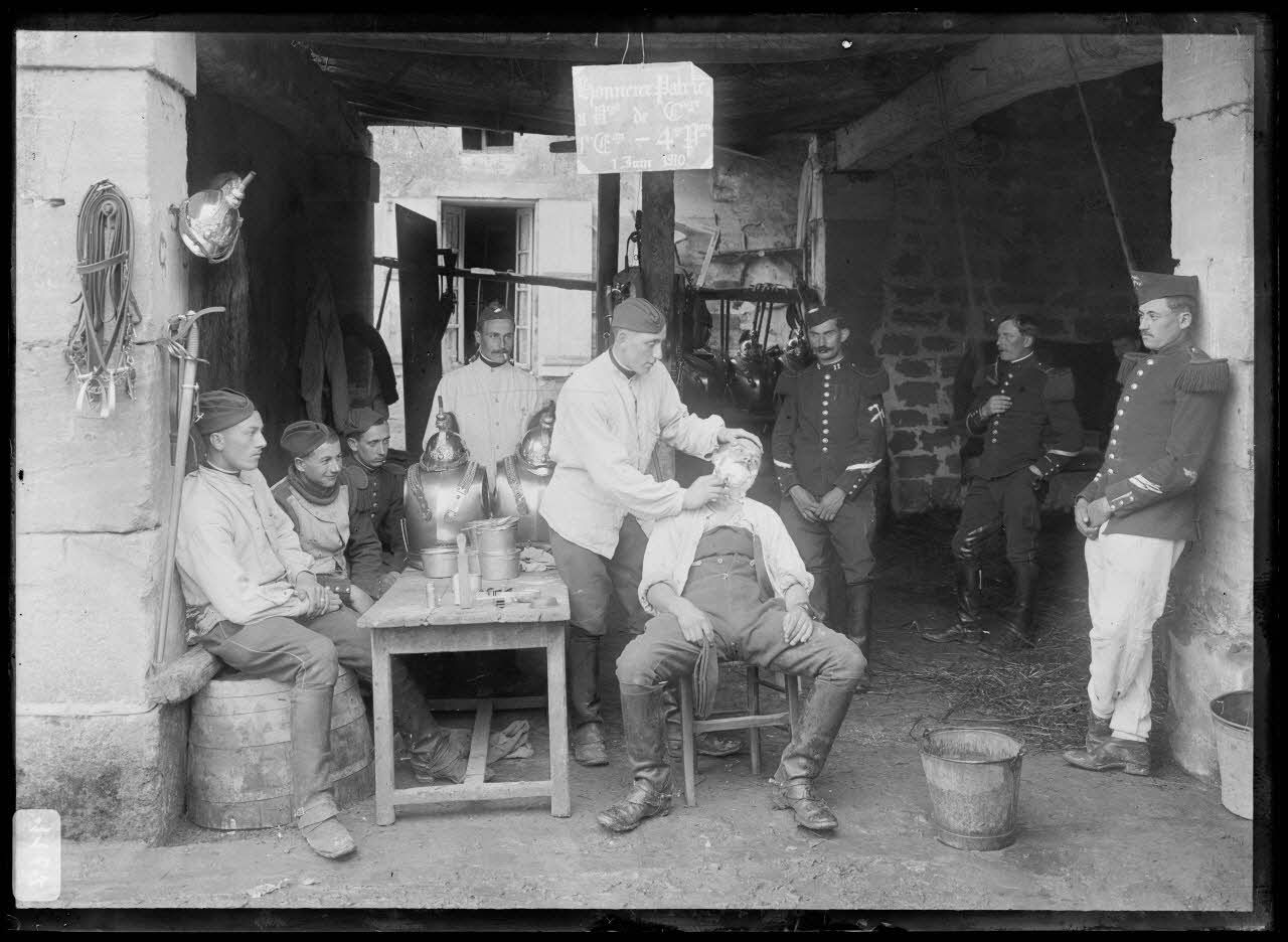 Arme blindée cavalerie - Le barbier rase un soldat; sur une affichette "Honneur et Patrie, 11e régiment de cuirassiers,1er escadron, 4e peloton, 1er juin 1910". [légende d'origine]