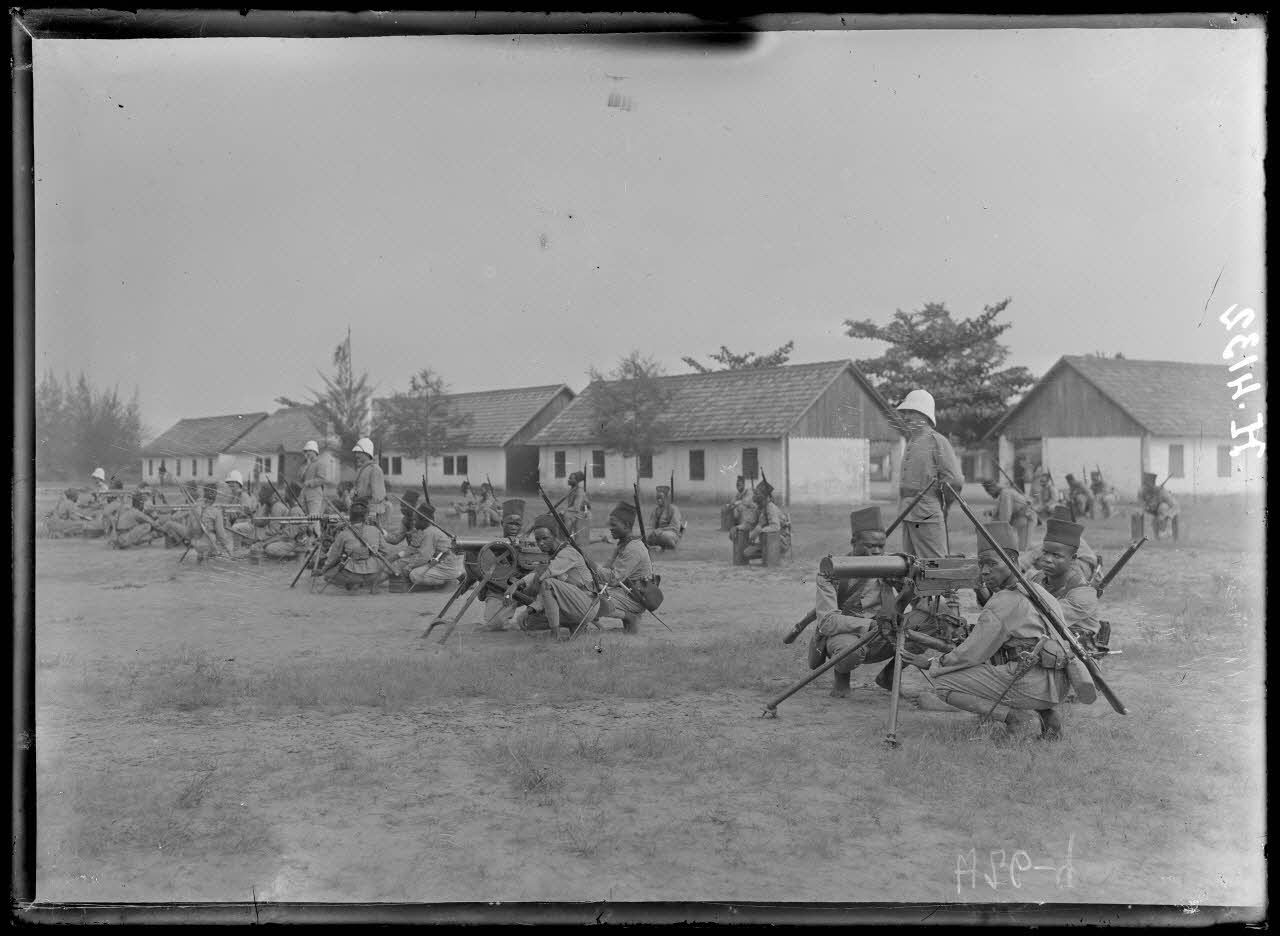 A la caserne de Douala, les tirailleurs s'exercent au tir sur des mitrailleuses Hotchkiss et MG, sous la direction d'un instructeur.