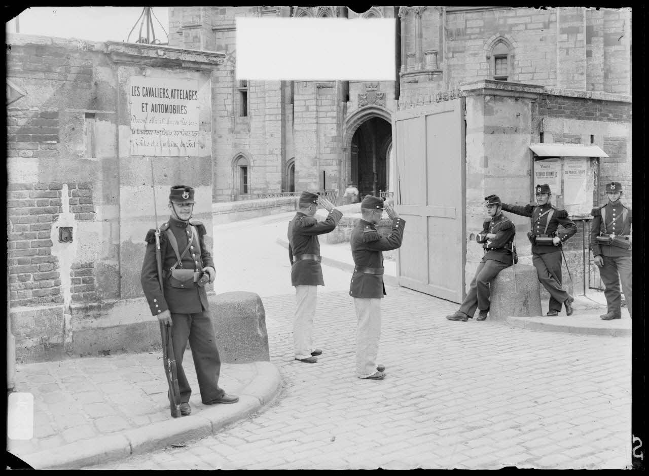 Les soldats du 26e bataillon de chasseurs à pied devant l'entrée d'un fort (Vincennes 1910-1913). [légende d'origine]