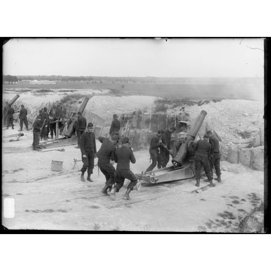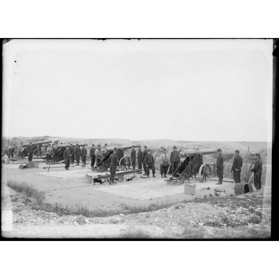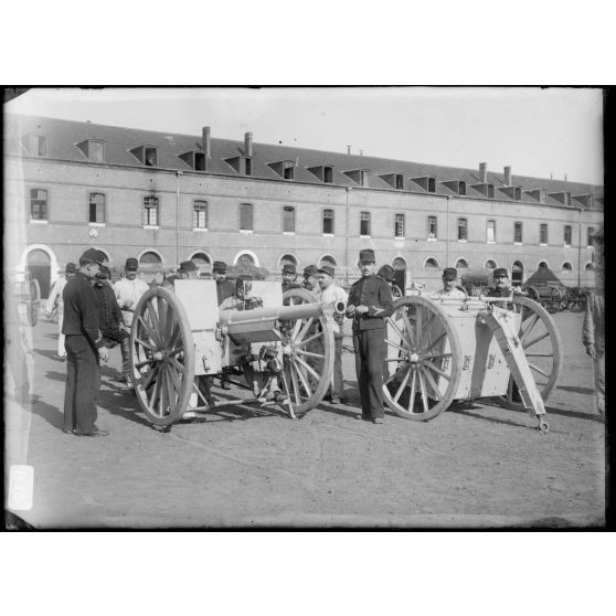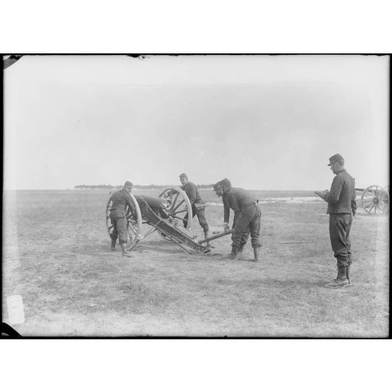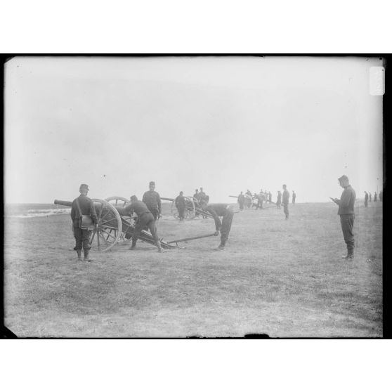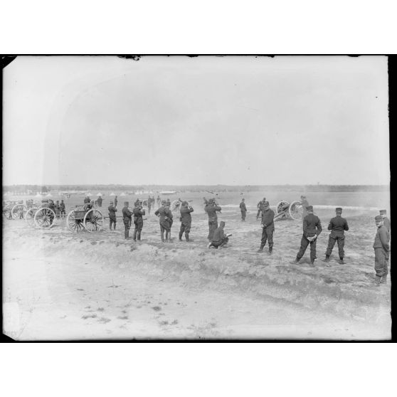 Artillerie - Les servants et les canons relevés dans le champ de manœuvres.