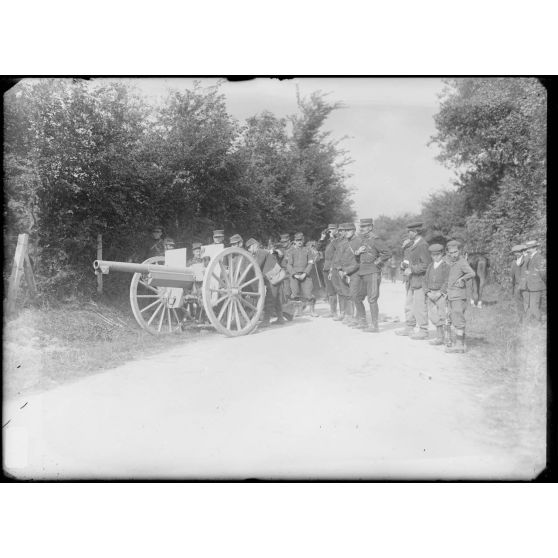 Artillerie - Le canon de 75 mm dans un chemin, encadré par les artilleurs et la population.