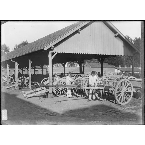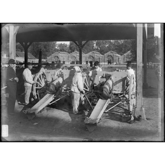 Artillerie - les servants nettoient les canons dans la caserne.