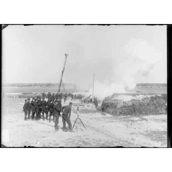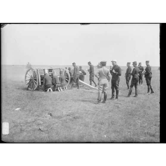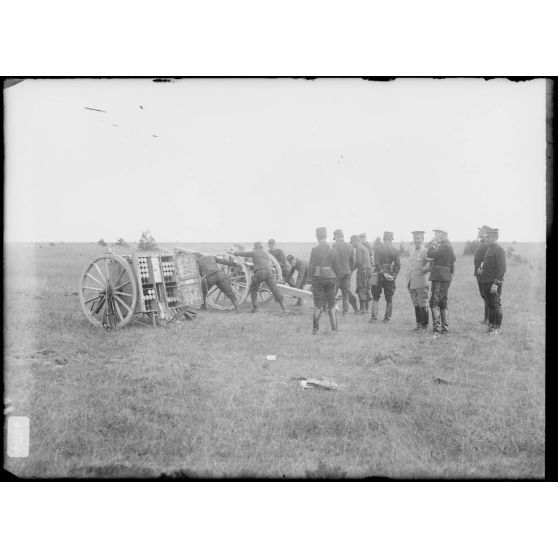 Artillerie - Les manœuvres du canon de 75 mm sous les yeux des officiers (et de l'officier japonais en visite).