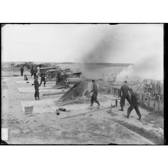 Artillerie - Manœuvres autour du canon, les servants sortent les charges des caissons de munitions.