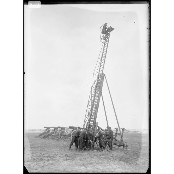 Artillerie - Les manœuvres, exercices en plein air, artilleur monté sur une grande échelle pour relever les positions.