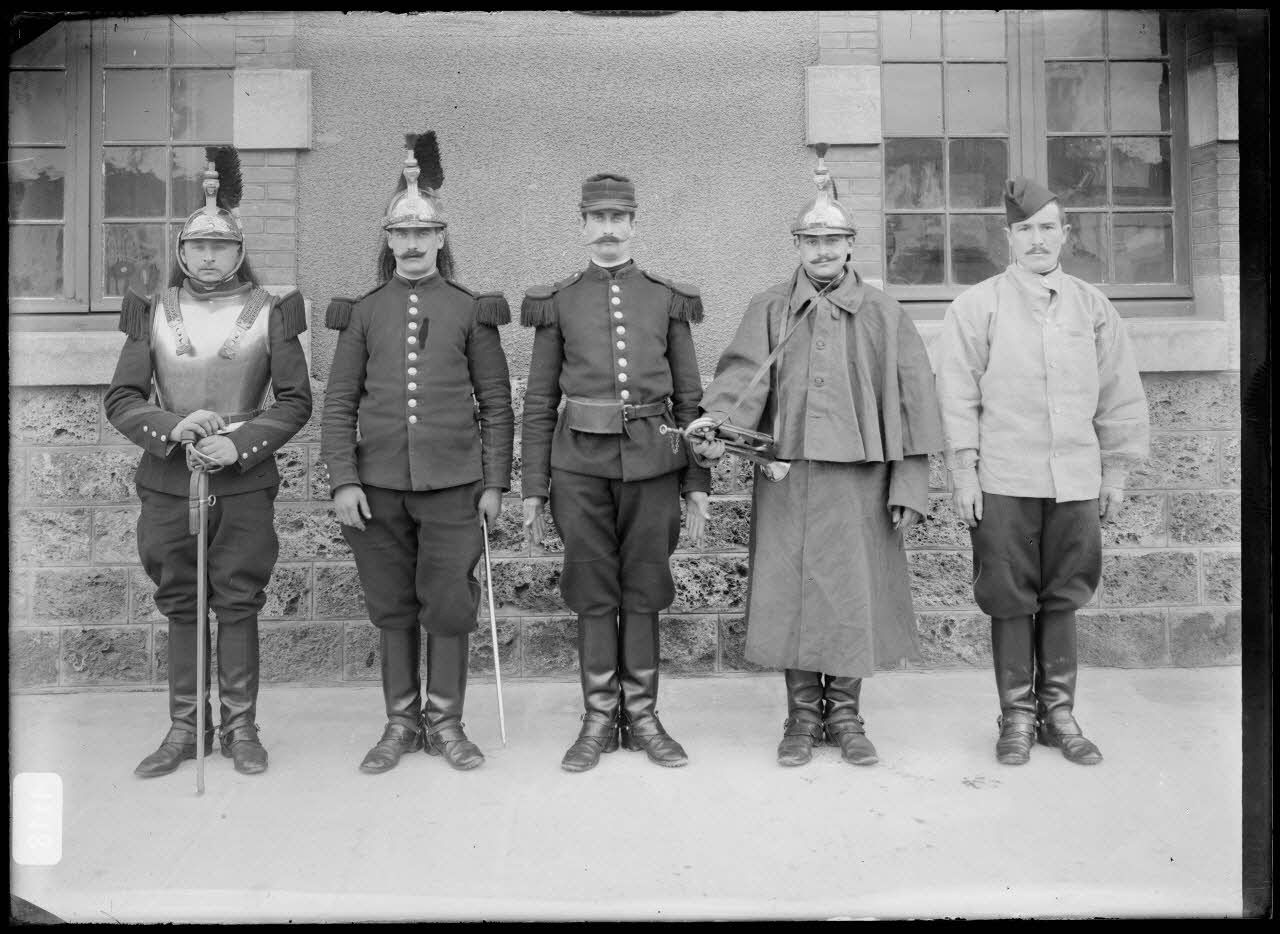 Cinq soldats portant les cinq tenues différentes des dragons sont alignés devant le mur de la caserne. [légende d'origine]