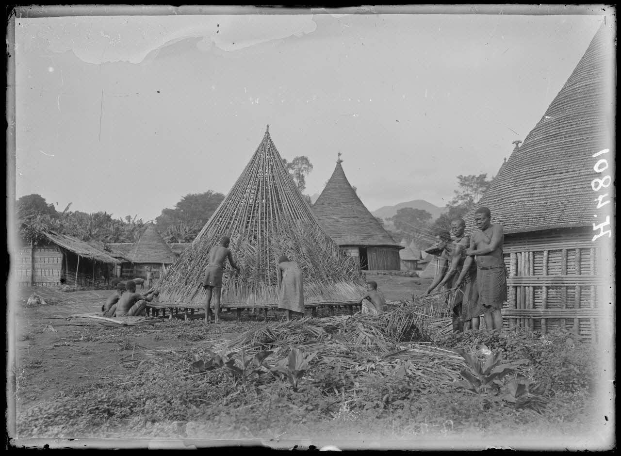 Mbureku, altitude 1315 m. Une vue sur le village, confection d'une hutte. [légende d'origine]