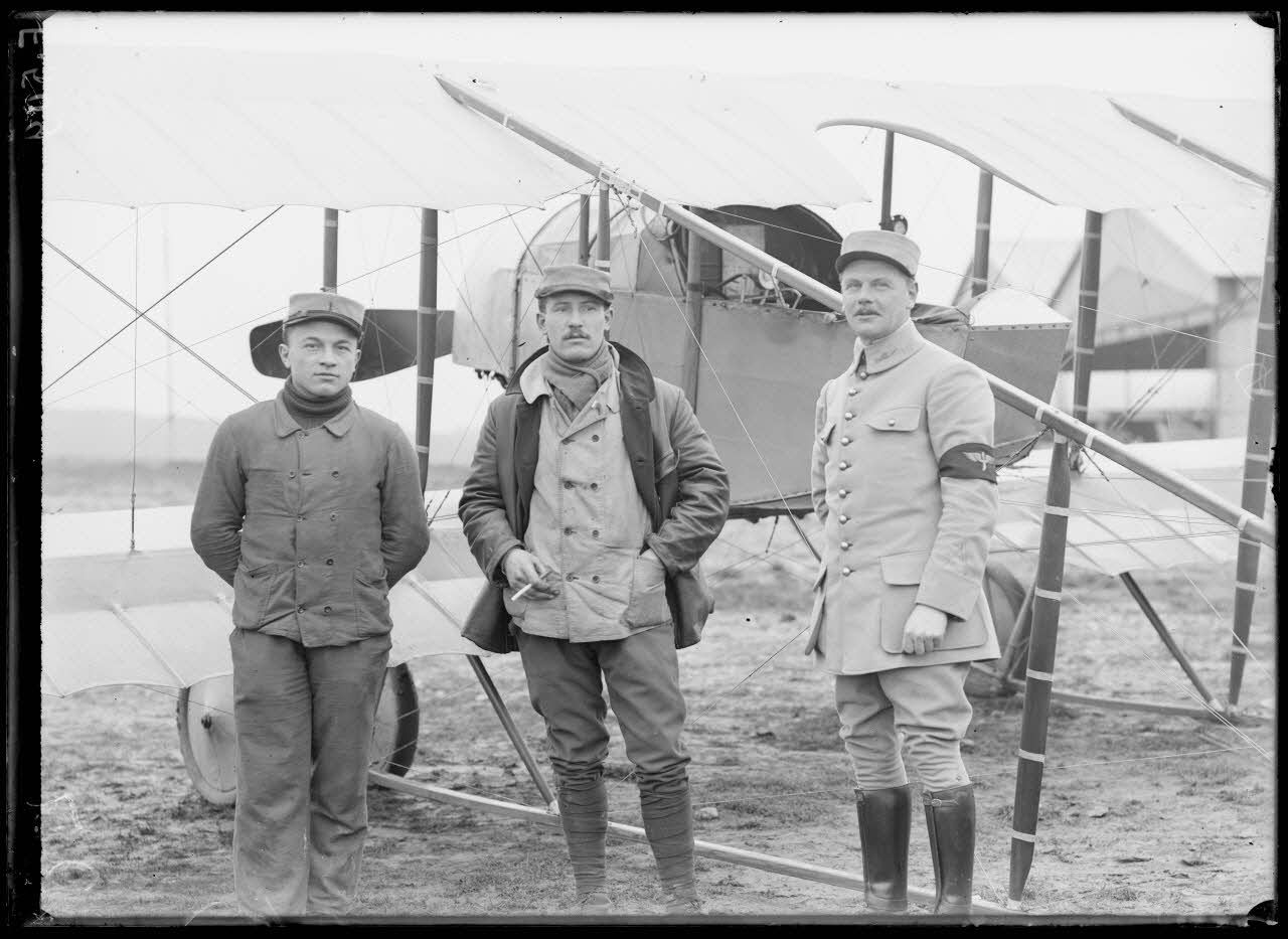 Les avions identifiés en arrière plan sont des Caudron G3 et G4 ainsi qu'un Farman MF11 bis.