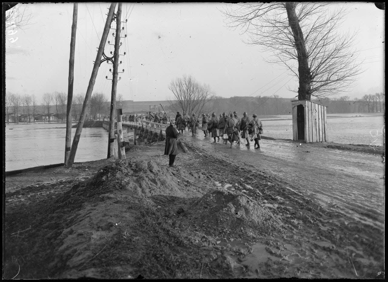 Dieue-sur-Meuse, inondations de la Meuse, panorama de Dieue. Au fond, le fort de Génicourt. La rentrée des permissionnaires. [légende d'origine]