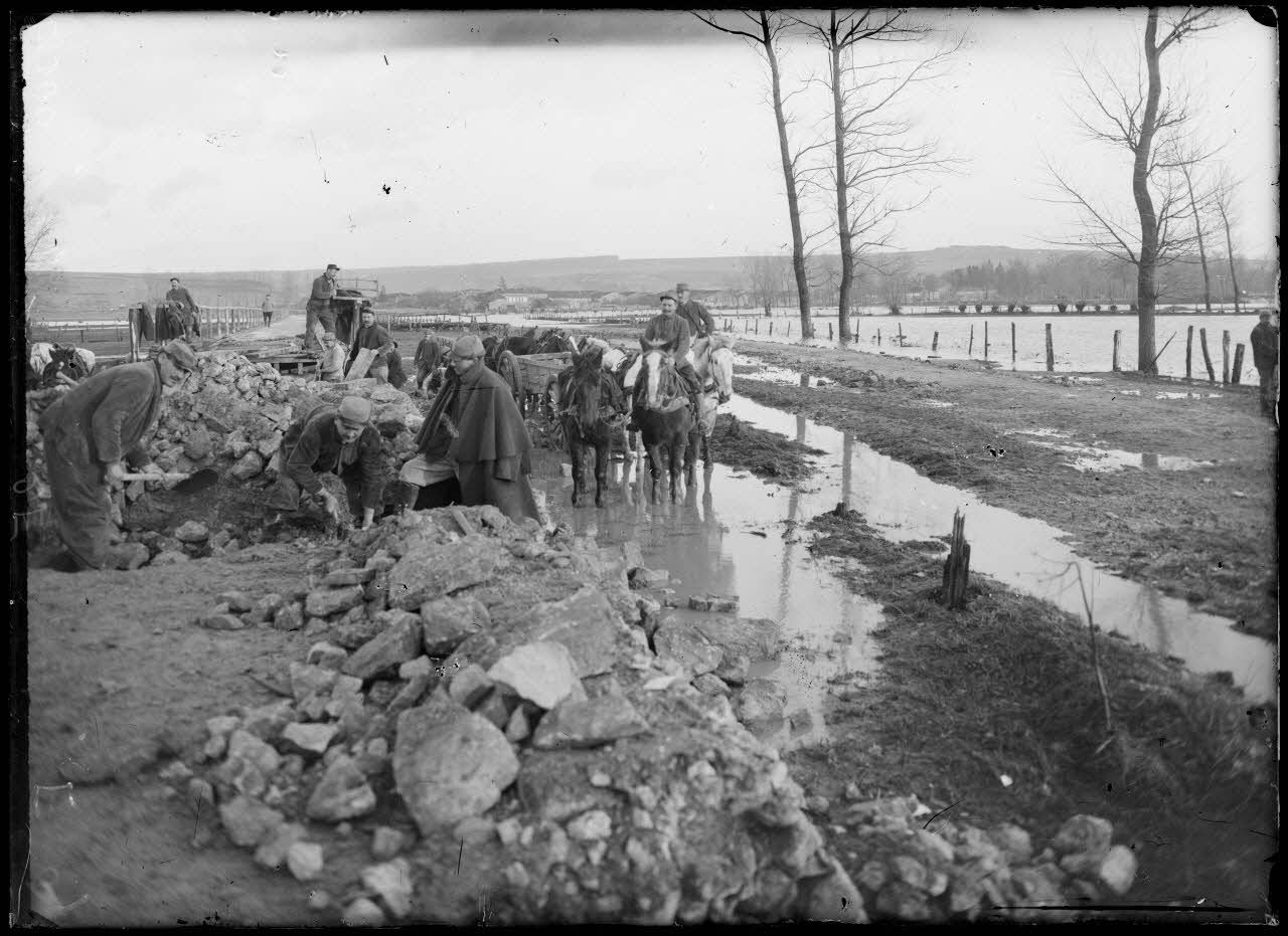 Dieue-sur-Meuse, inondations de la Meuse, panorama de Dieue. Au fond, le fort de Génicourt. La rentrée des permissionnaires.