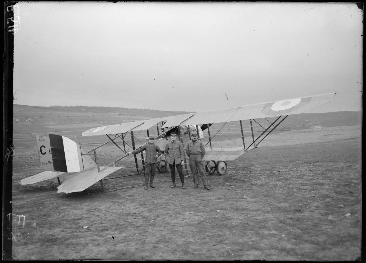 Les avions identifiés en arrière plan sont des Caudron G3 et G4 ainsi qu'un Farman MF11 bis.