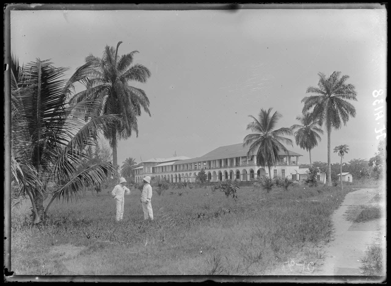Deux officiers en tenue coloniale sont en conversation dans le jardin de l'hôpital européen de Douala.