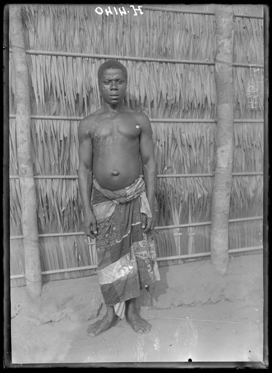 Un indigène de l'ethnie Douala habillé d'un pagne pose devant une palissade.