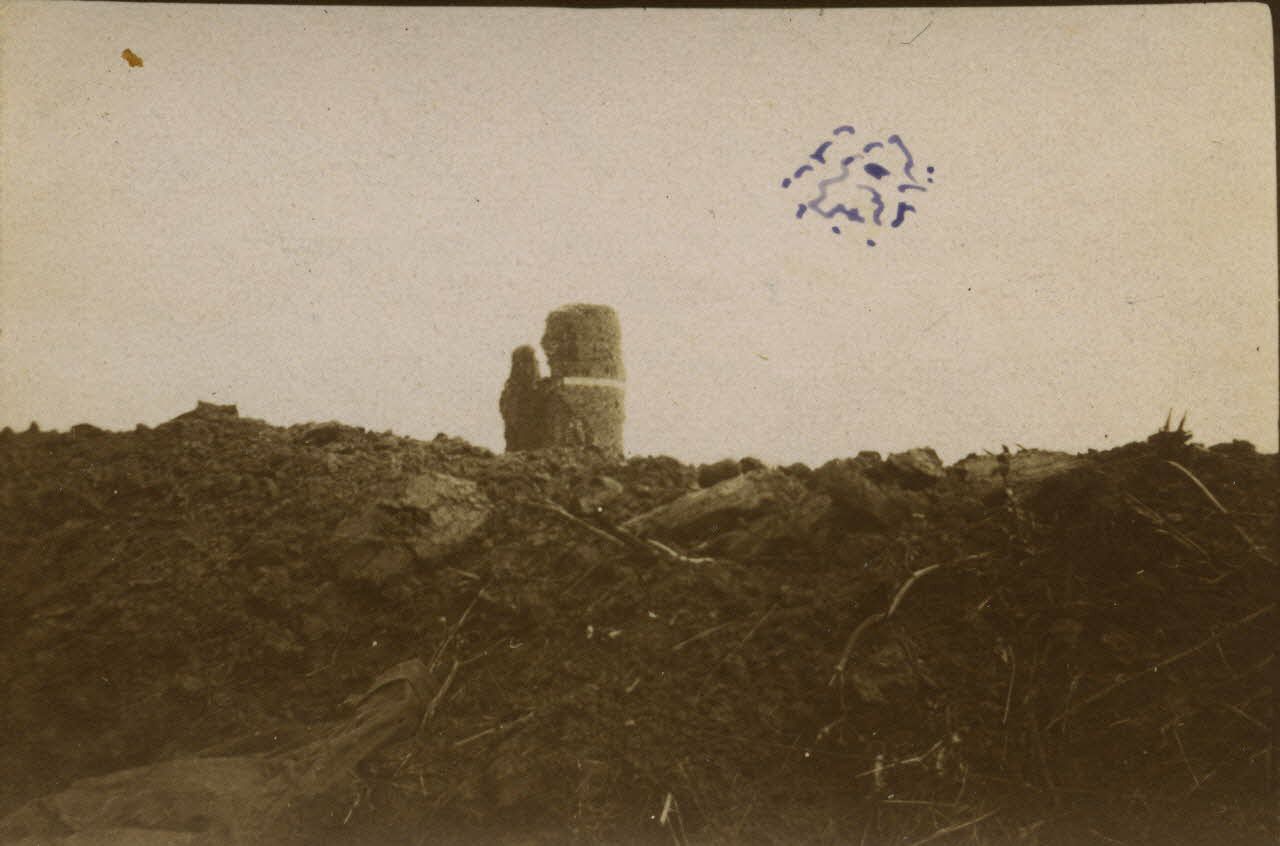 8 juillet 1916. Tour devant Estrées (moulin à vent) avec shrapnell en l'air pendant que je portais mon [illisible]. [légende d'origine]
