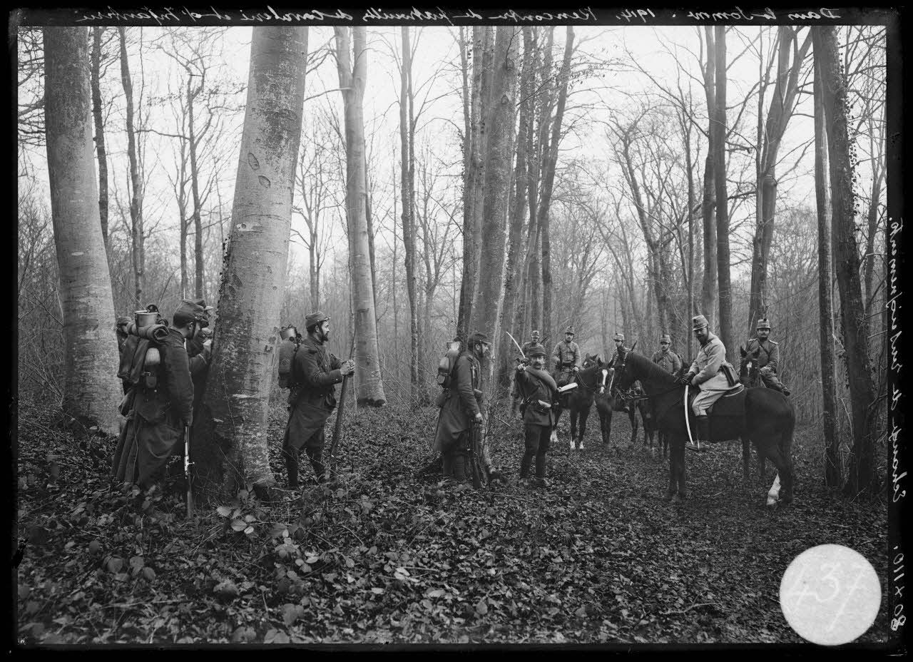 80x110, échange de renseignements, dans la Somme, 1914, Rencontre de patrouilles de cavalerie et d'infanterie. [légende d'origine]