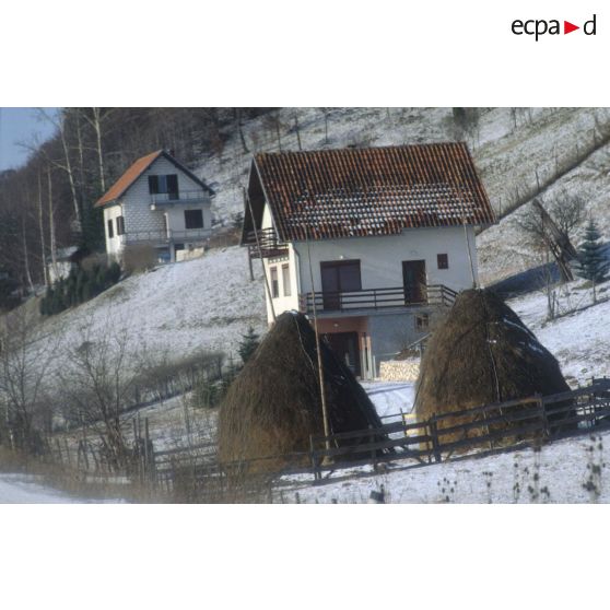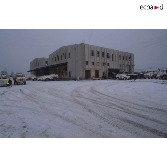 Vues extérieures des bâtiments du BAT INF 2 (bâtiments vie et PC opérations) tenu par le RICM dans le quartier de Nedzarici enneigé.