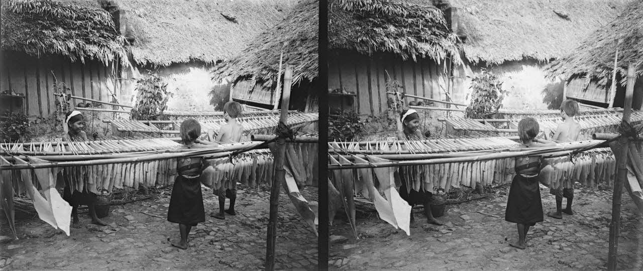 Confection du papier au village du Papier dans les environs de Hanoï. Voir les références D0388-039-002-0884 à D0388-039-002-0893 afin d'observer l'ensemble des étapes de fabrication. La datation de fin de la prise de vue, c'est-à-dire le 31 mars 1907, est déduite de la mention manuscrite à la fin de l'album "Hanoï. 5. 801-1000" : "Les épreuves ont été tirées en mars 1907, à Hanoï, sur papier au bromure Nikko, et traitées à l'alun de chrome".