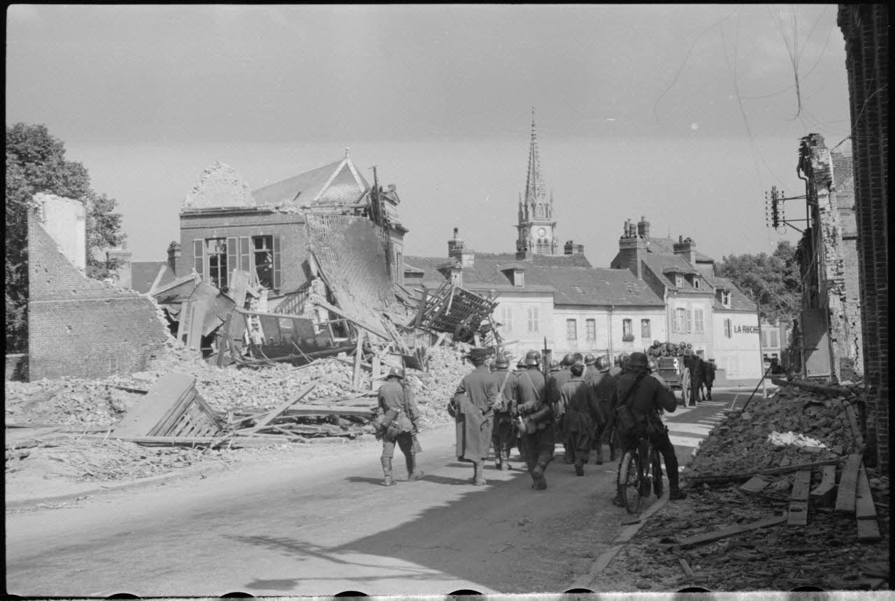 A Abbeville, des prisonniers français du 15e RI sont encadrés par des soldats allemands, ils marchent dans une rue dévastée. Le clocher de l'église Saint-Jacques dépasse des maisons (DAA 557 L09 à L11).
