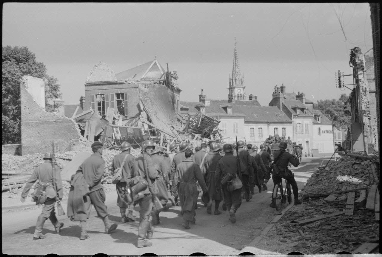 Des prisonniers britanniques passent devant la gare du Cambrésis, à Cambrai sur laquelle on peut lire les noms de quatre communes (Le Cateau, Denain, Caudry, Saint-Quentin). Le char Renault B1 bis "Crécy-au-Mont" du lieutenant Blondelet détruit sur le mont Caubert qui domine la ville d'Abbeville. Suite à une contre-attaque française, le blindé est entouré d'un canon de 8,8 cm Flak qui vient d'être détachée de son tracteur. e pièces d'artillerie allemandes qui se déploient.