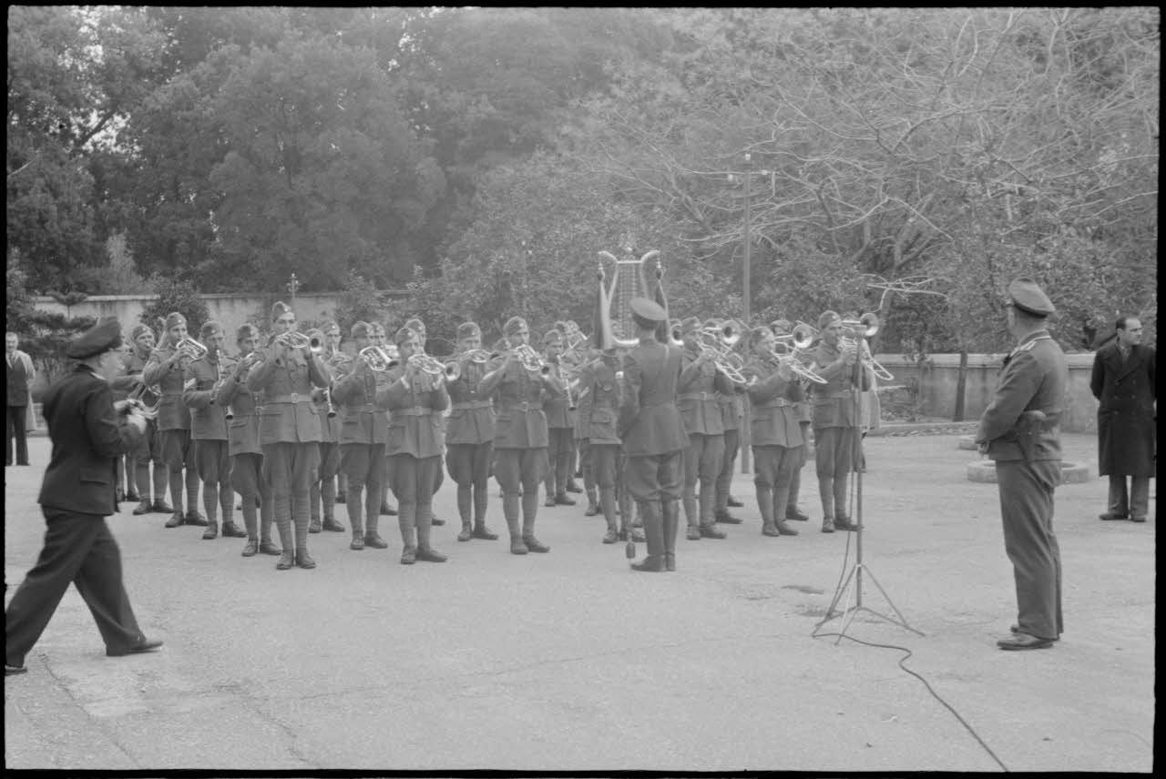 A Athènes, une rencontre entre des civils, des militaires grecques et des membres de le Luftwaffe alors que le défilé de la garde d'honneur a lieu devant la palais présidentiel (ou palais royal ou parlement).
