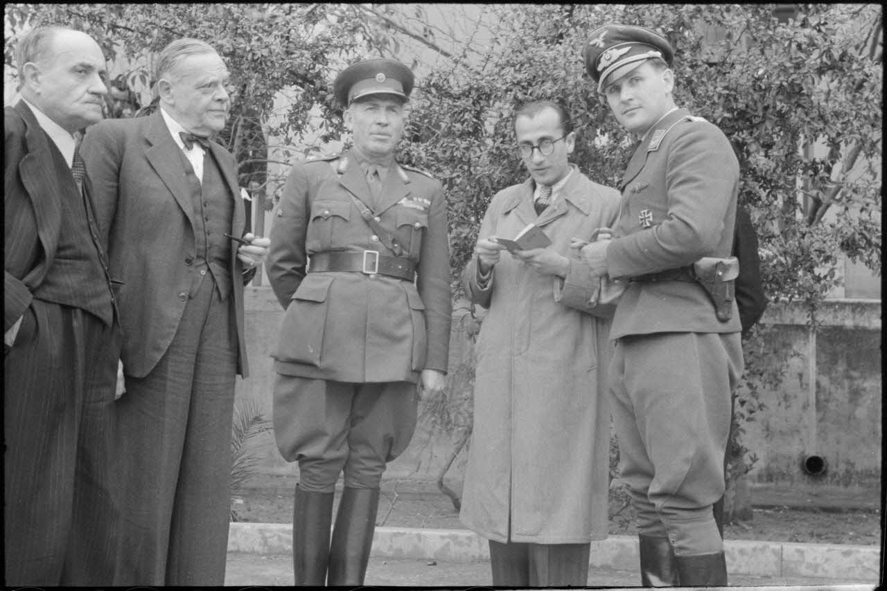 A Athènes, une rencontre entre des civils, des militaires grecques et des membres de le Luftwaffe alors que le défilé de la garde d'honneur a lieu devant la palais présidentiel (ou palais royal ou parlement).