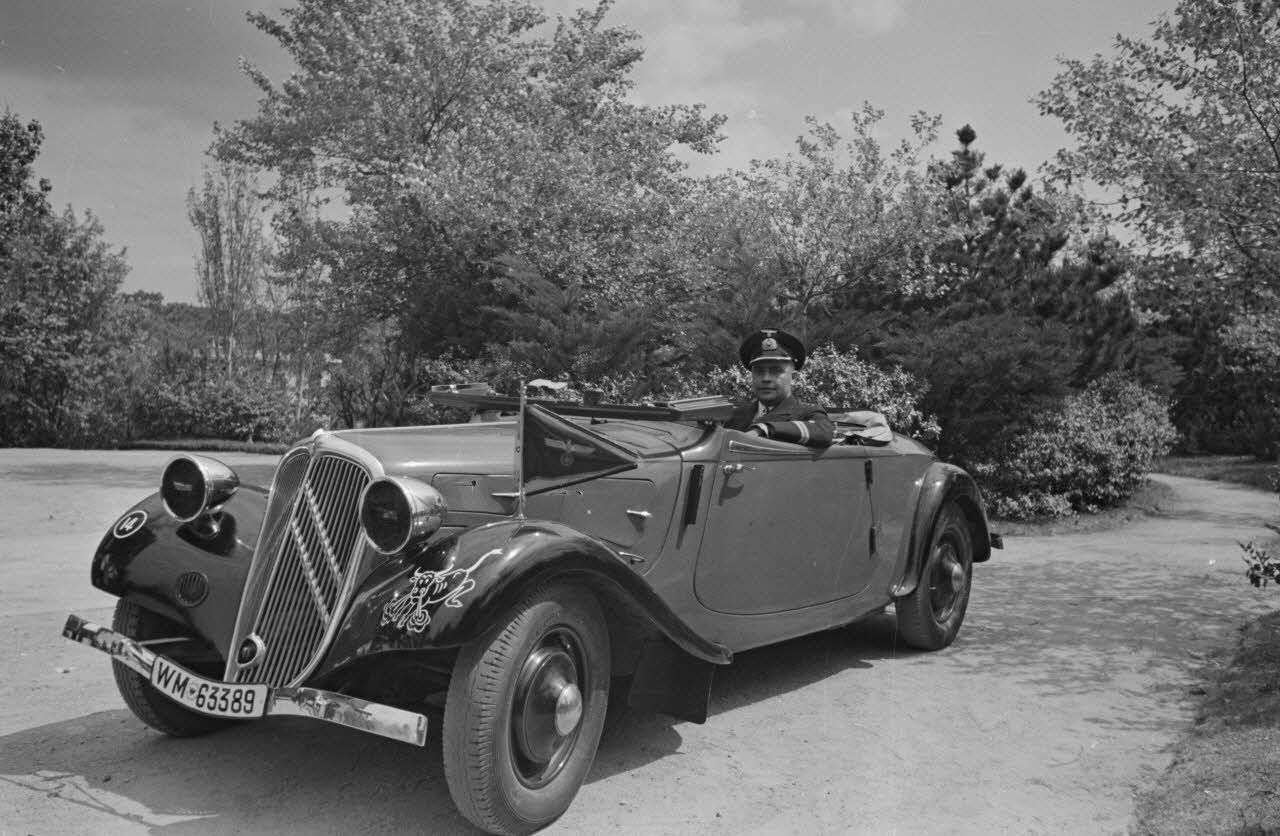 A bord d'un cabriolet Citroën Traction à l'éfigie de la 7.Unterseebootsflottille, le lieutenant (Oberleutnant) Erich Zurn, titulaire de la croix de chevalier de la croix de fer.