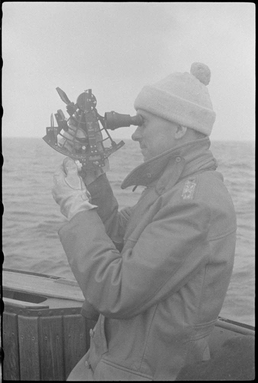 A bord d'un dragueur de mines de la classe 1940, un capitaine (Kapitänleutnant) utilise un sextant.