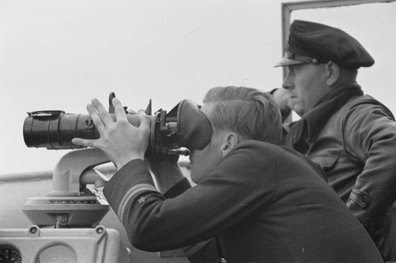A bord d'un dragueur de mines (Minensuchboot), observation à l'aide de jumelles.