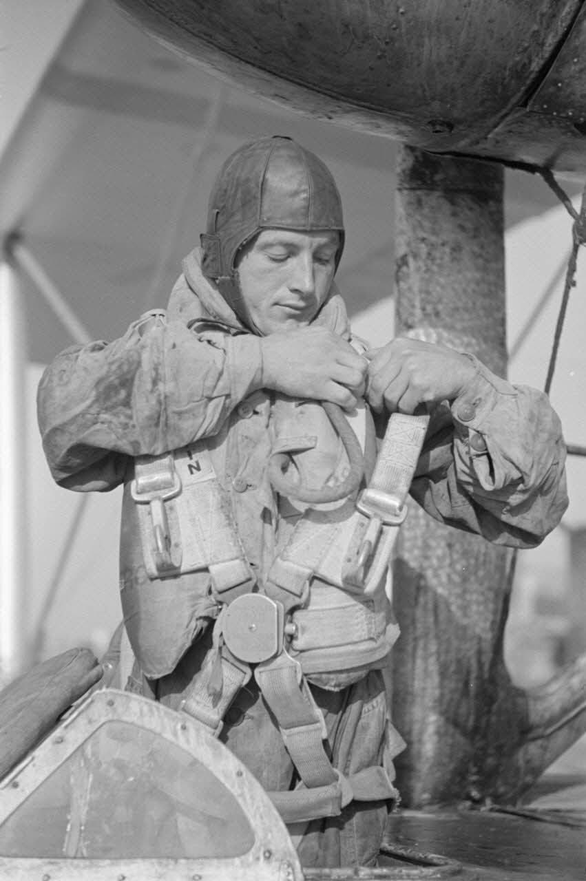 A bord d'un Heinkel He-114, un pilote roumain du Grupul 9 peu avant une mission de bombardement.