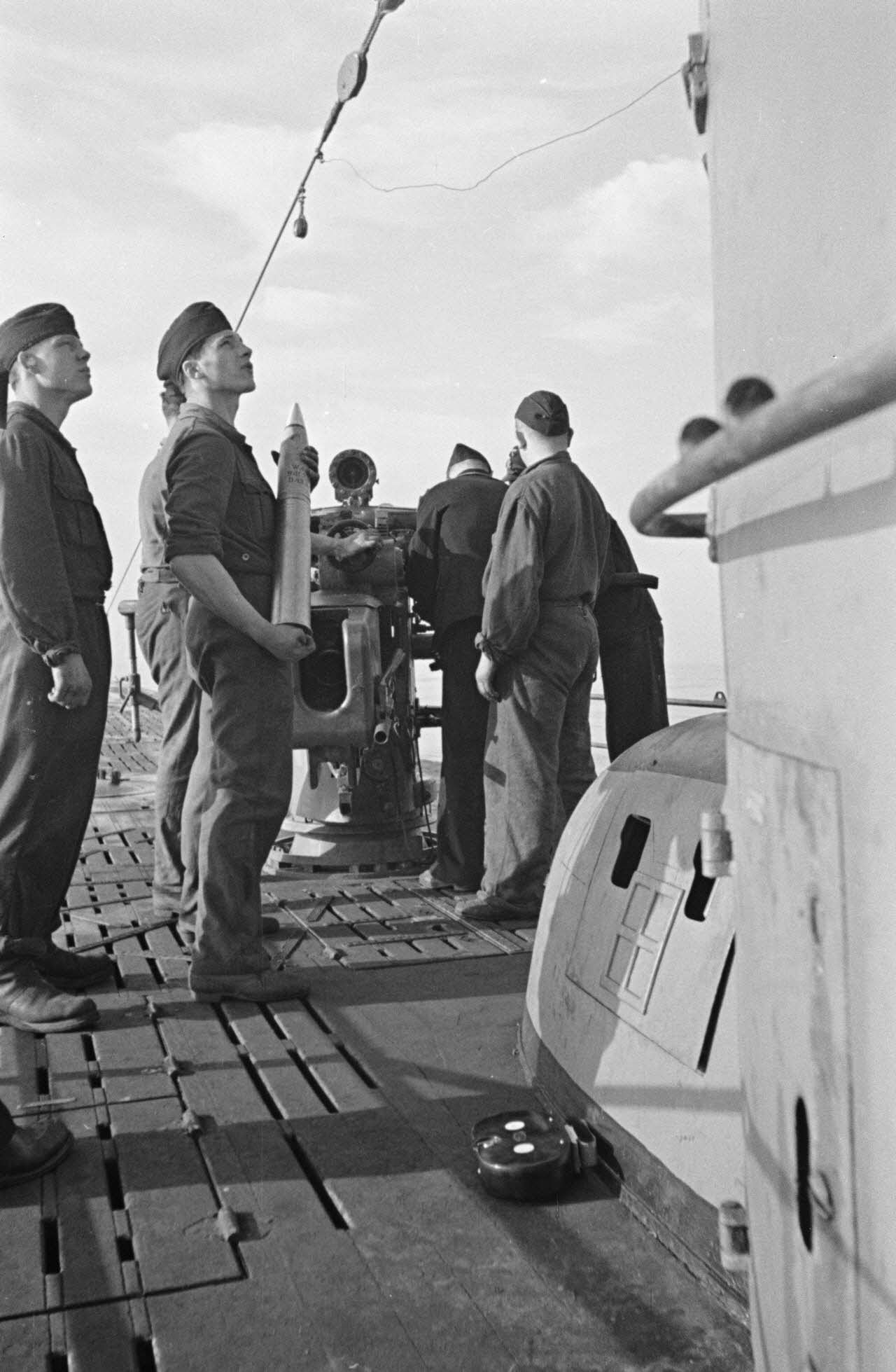 A bord d'un sous-marin allemand (U-boot), les sous-mariniers s'exercent au canon de 10,5 cm SK C/32 (Schnellladekanone - canon à chargement rapide).