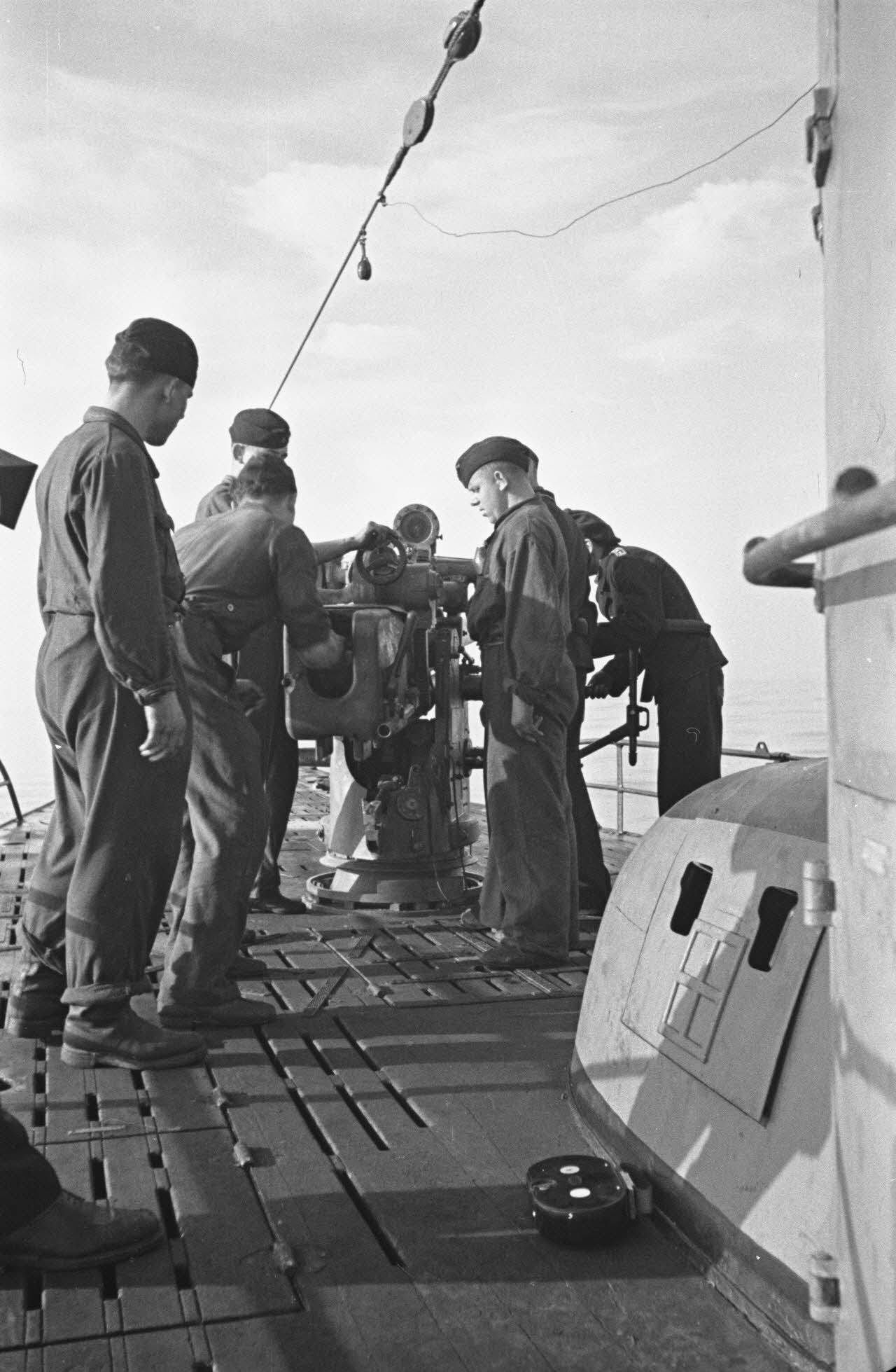 A bord d'un sous-marin allemand (U-boot), les sous-mariniers s'exercent au canon de 10,5 cm SK C/32 (Schnellladekanone - canon à chargement rapide).