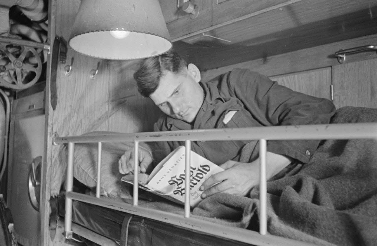 A bord d'un U-boot, dans le cadre de la semaine du livre allemand, des sous-mariniers allemands parcourent des ouvrages allongés sur une couchette.