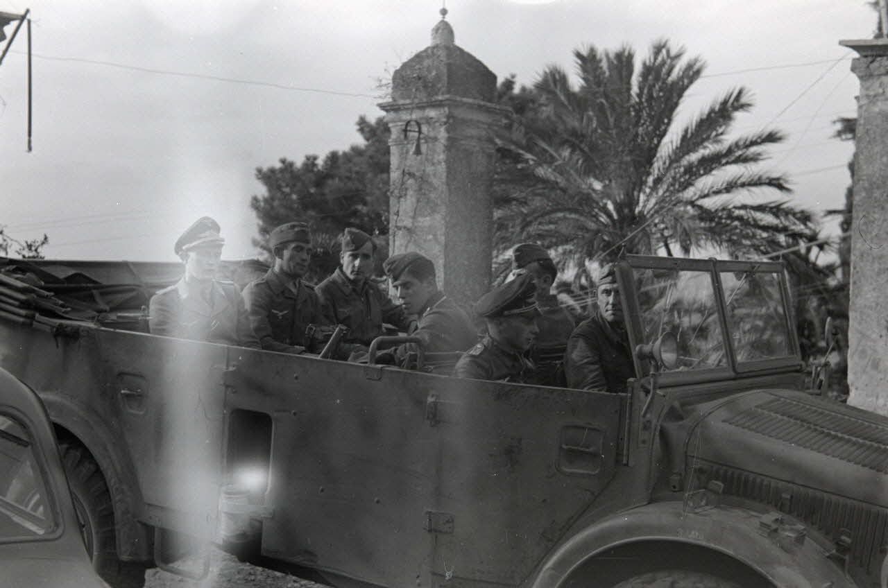 A bord d'un véhicule Horch 108 Type 40, des personnels du Schlachtgeschwader 4 (I.SG.4) quittent le poste de commandement du 1er groupe.