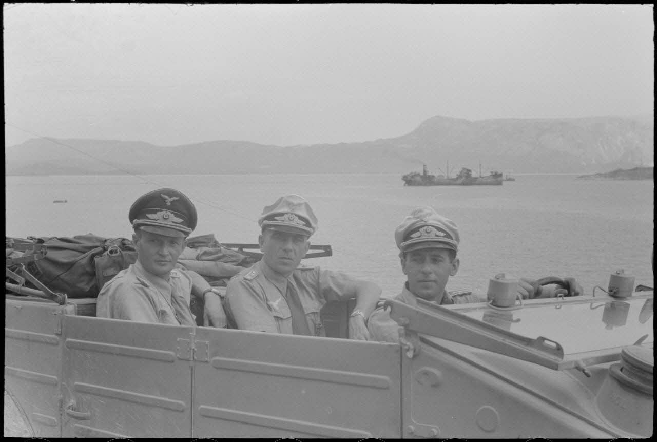 A bord d'une Volkswagen Kübelwagen, des officiers de l'armée de l'air allemande quittent le vieux fort de Corfou.