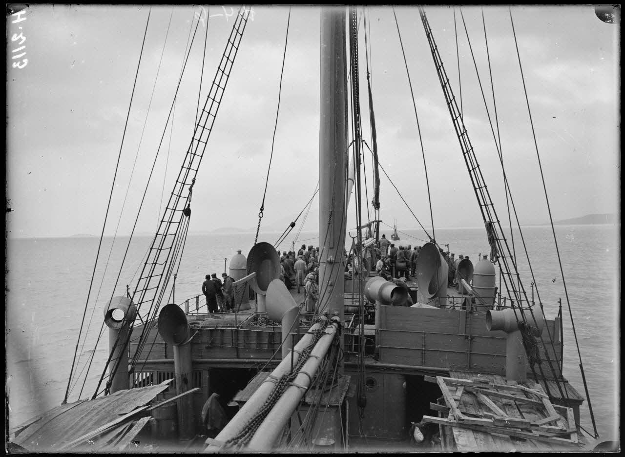 En rade de Corfou. A bord du Waldeck Rousseau. La garde rassemblée.