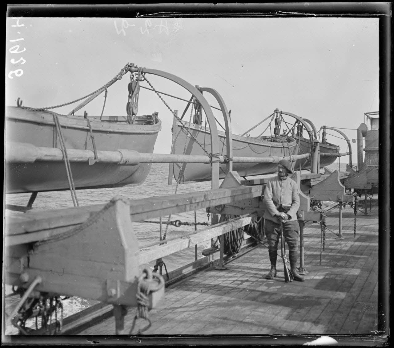 A bord de l'Algérie. La garde devant les canots de sauvetage prêts à être mis à la mer. [légende d'origine]