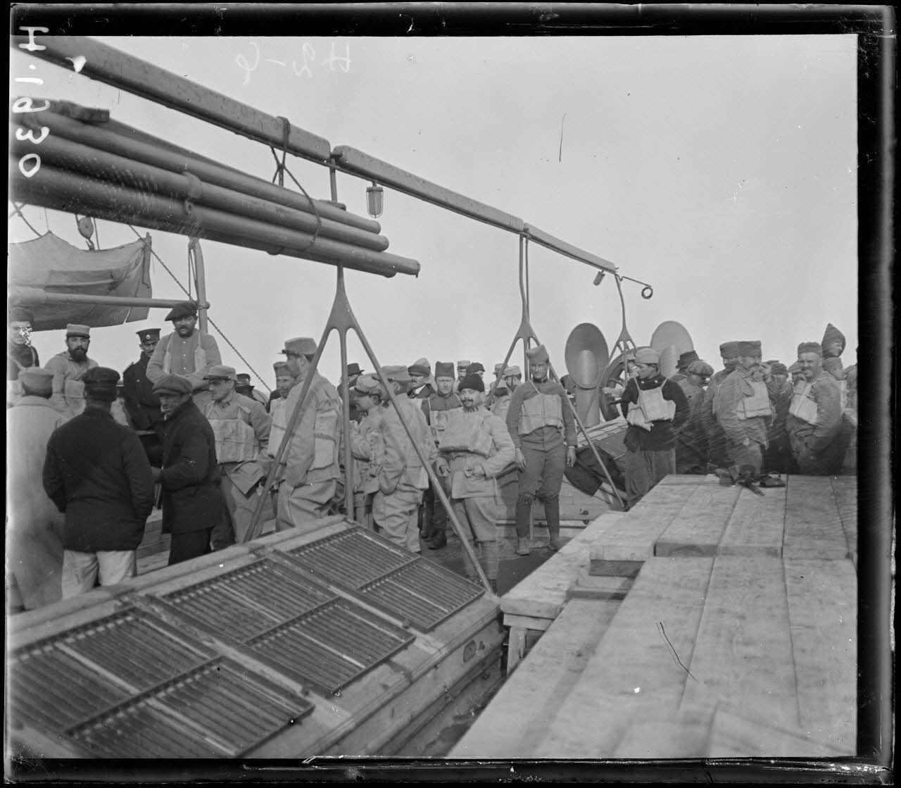 A bord de l'Algérie, soldats français et serbes munis de ceintures de sauvetage.