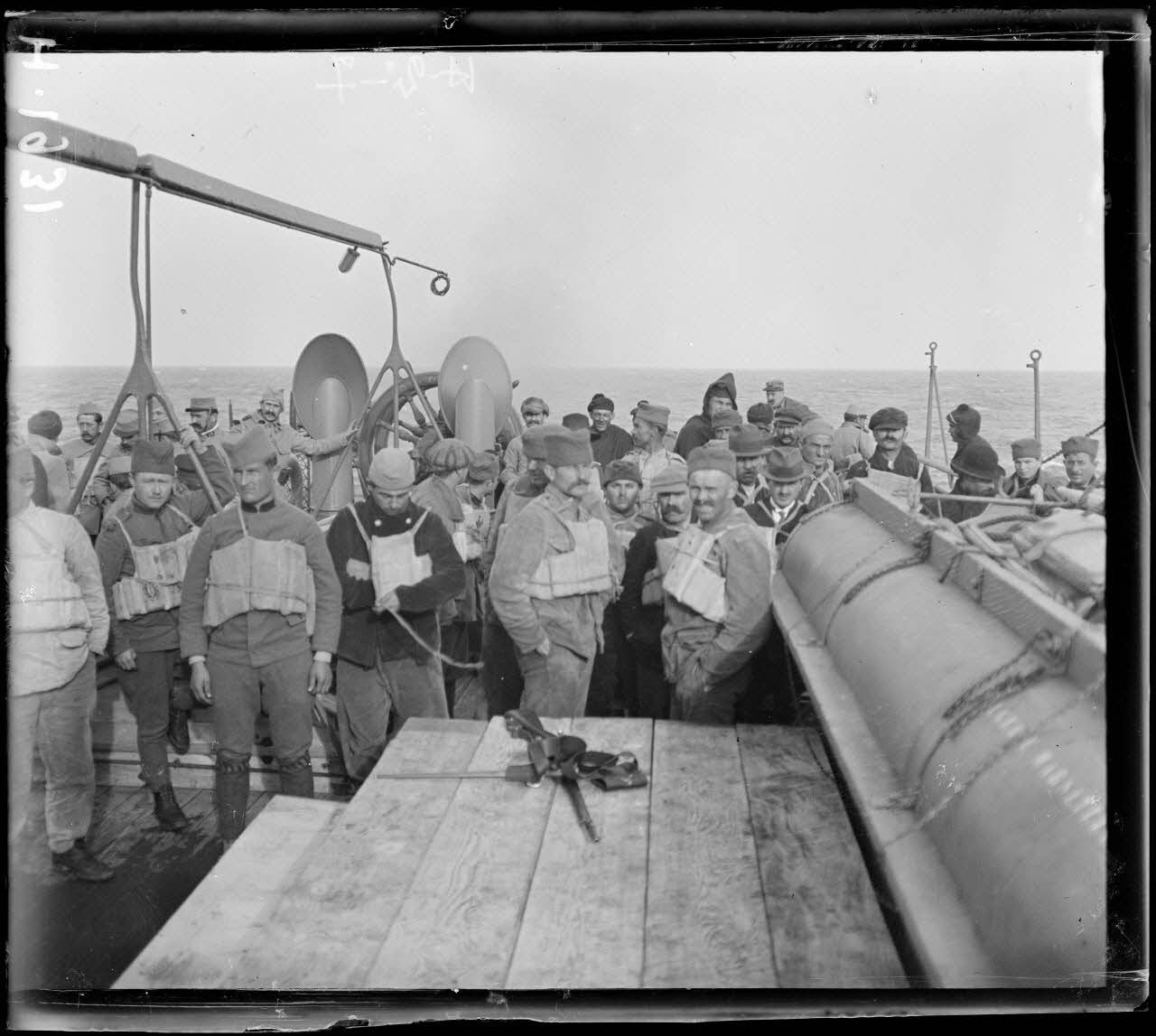 A bord de l'Algérie, soldats français et serbes munis de ceintures de sauvetage.
