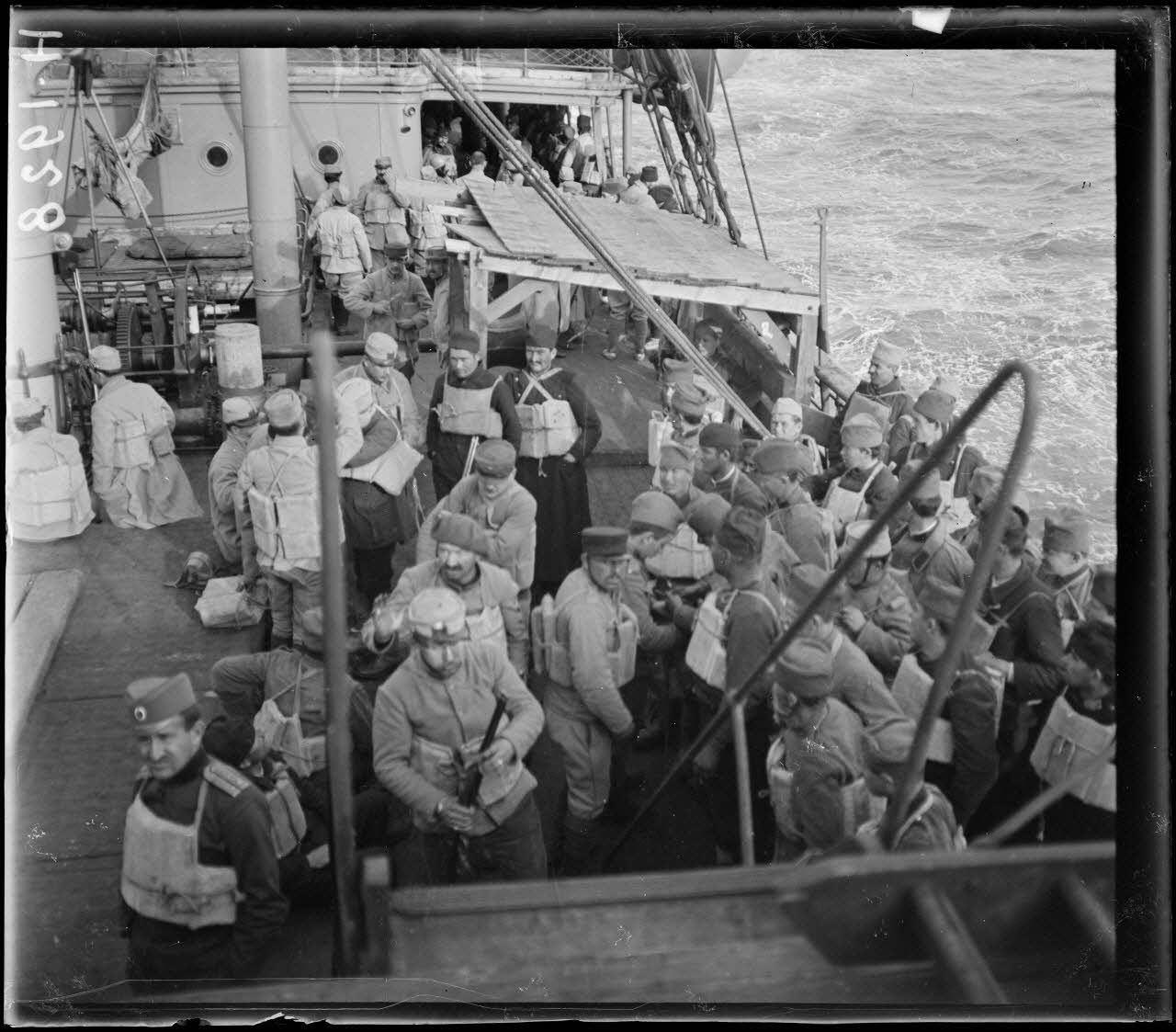 A bord de l'Algérie, soldats serbes et français munis de ceintures de sauvetage.