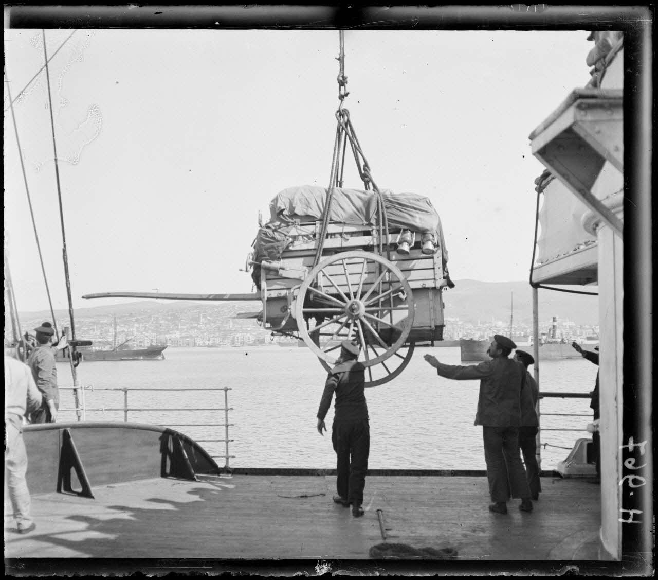 A bord de la Provence. Les voitures régimentaires gagnent la terre.