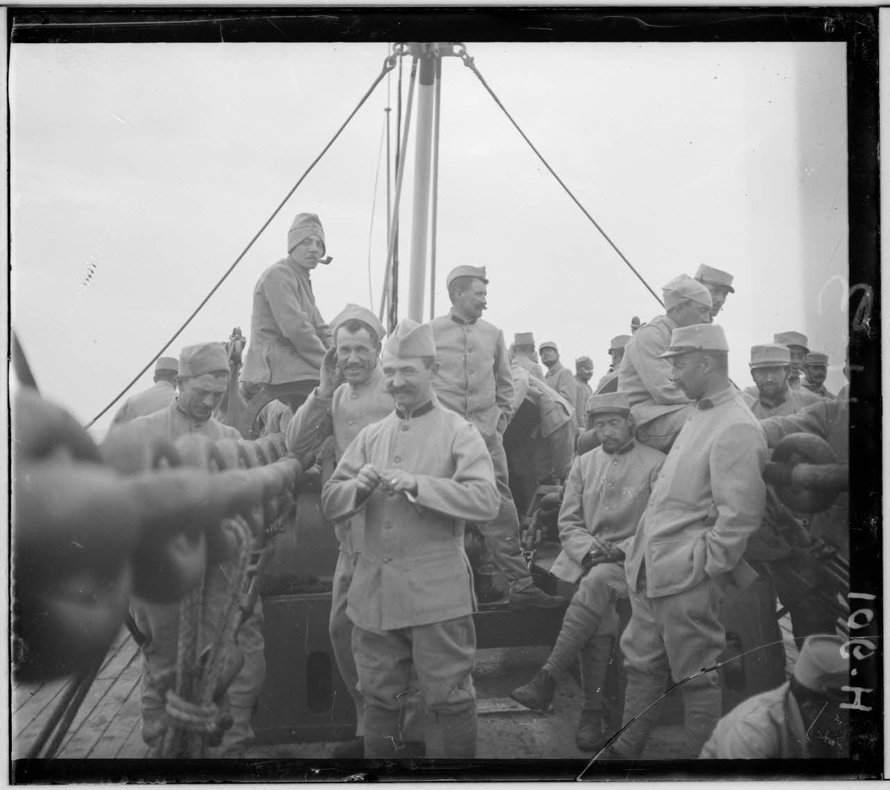 A bord de La Provence. Troupes sur le gaillard d'avant. [légende d'origine]