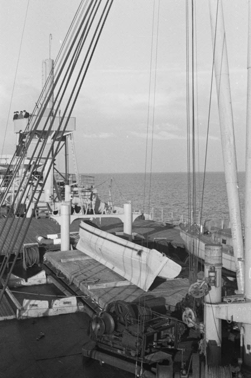 Un radeau de sauvetage à bord d'un dragueur de mines allemand baptisé briseur de blocus (Sperrbrecher).