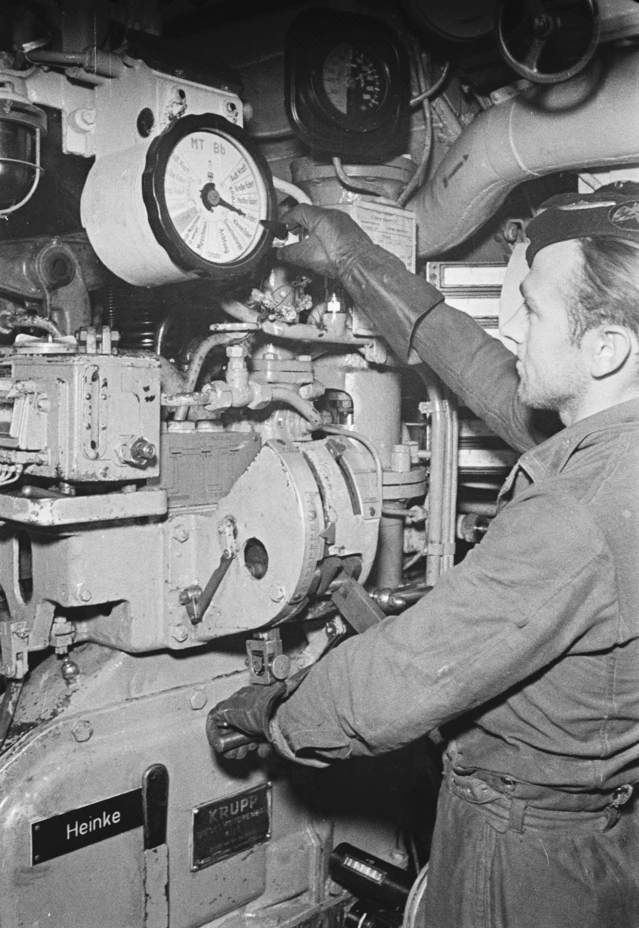 A bord du sous-marin U-203, un sous-marinier contrôle les moteurs.