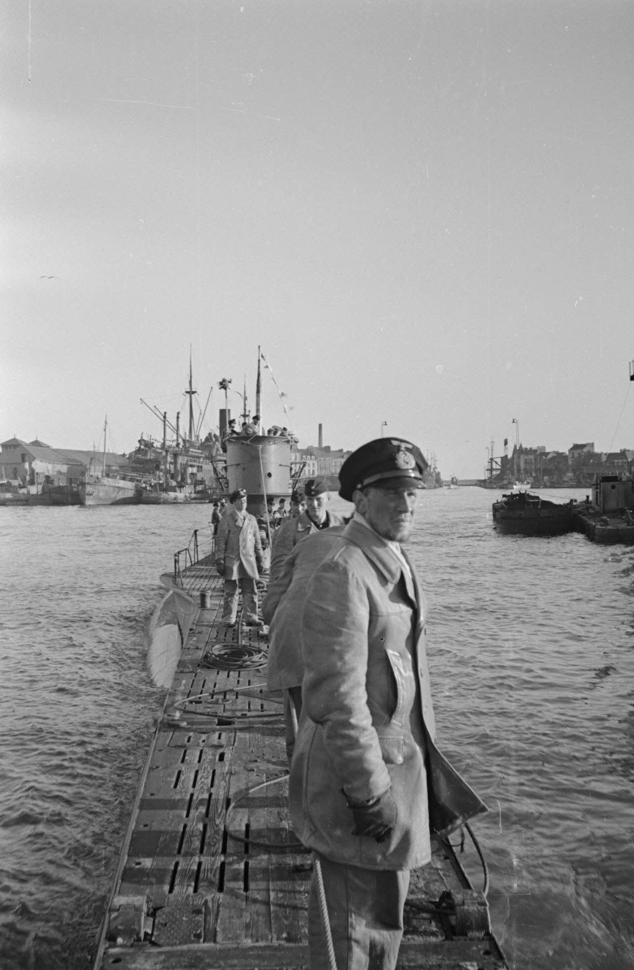 A Saint-NazaireLe Kapitänleutnant Endrass commandant du sous-marin Uboot U-46 sur le pont du U-97 (7.Uboot-Flotille), les deux sous-marins sont de retour de croisière par l'entrée sud du port.