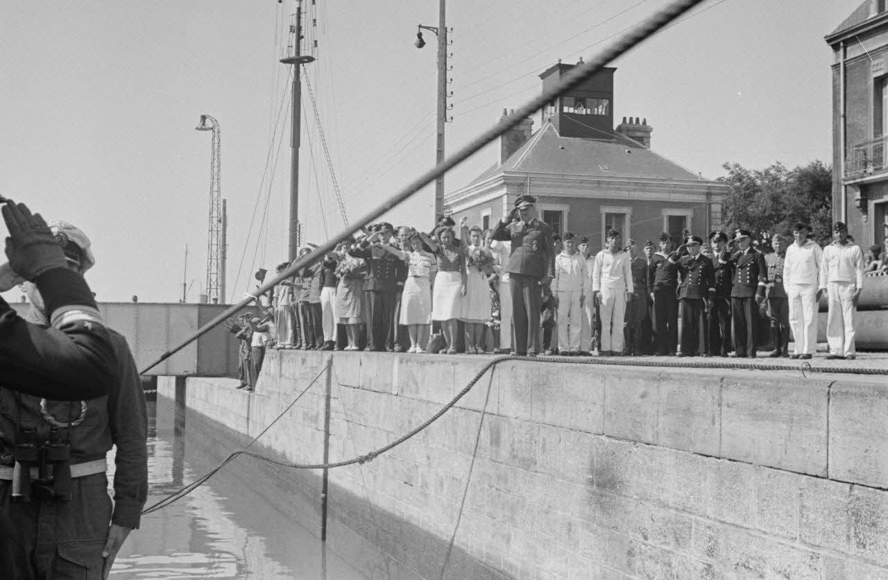A l'issue de sa 5e mission en mer à bord du sous-marin U-552, le lieutenant (Oberleutnant zur See) Erich Topp salue des autorités de la Kriegsmarine rassemblées sur le quai du port de Saint-Nazaire.