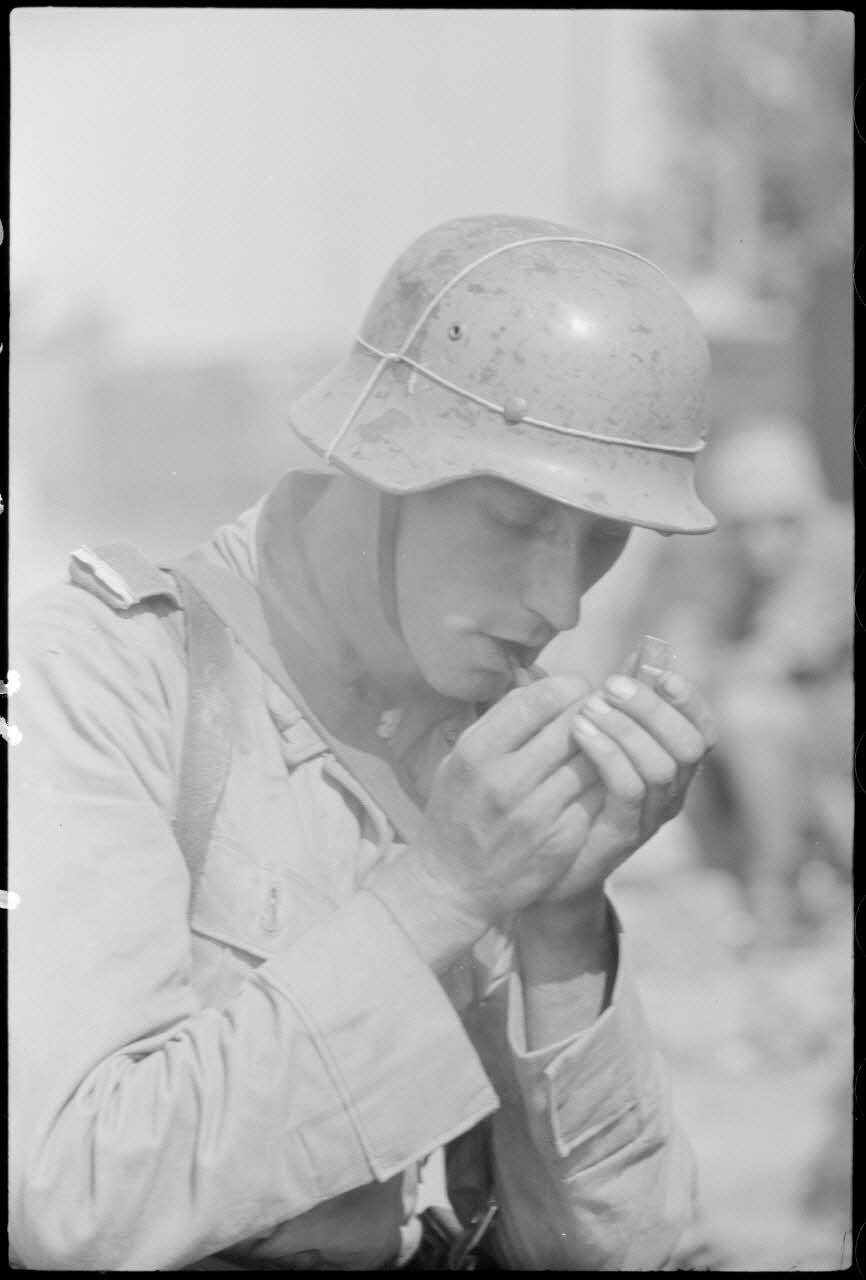 A Catane (Sicile) ou dans la banlieue de la ville, un fantassin du Panzergrenadier-Regiment Hermann Goering allume une pipe.