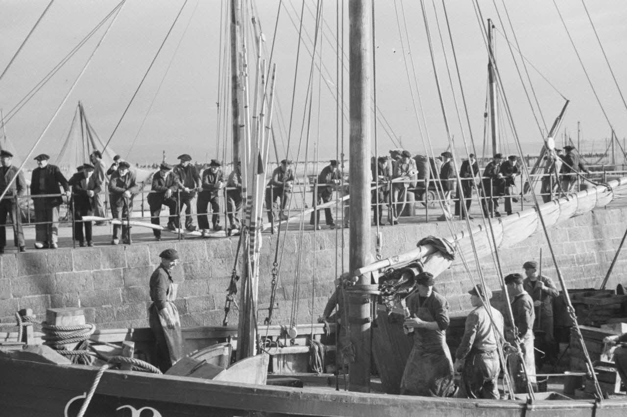 Des hommes âgés devant la pêche qui vient d'être déchargée dans le port de Douarnenez.