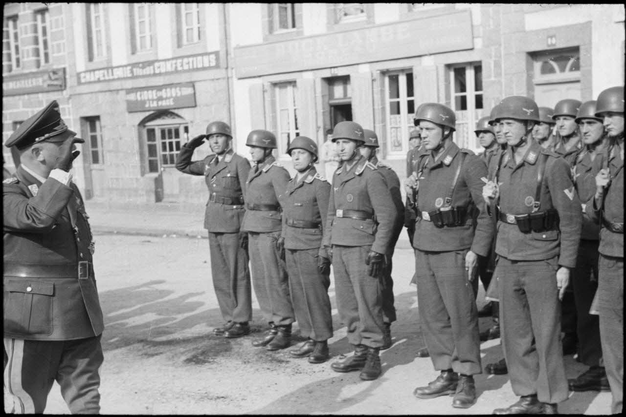 Un groupe d'officiers de la 3.Fallschirmjäger.Division lors d'une prise d'armes sur la place de Huelgoat (Finistère centre).