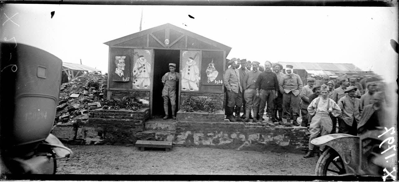 A Jussy (Aisne), membres de la mission italienne devant une cagna. [légende d'origine]