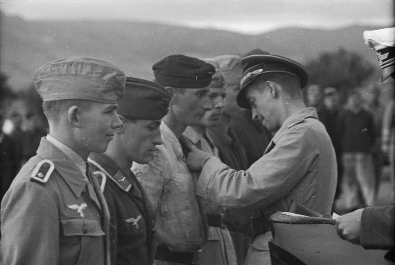 A Kastelli, le capitaine (Hauptmann) Meyer remet des décorations à des membres d'une unité de reconnaissance (Fernaufklärungsgruppe).